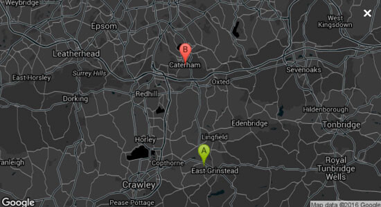 https://maps.googleapis.com/maps/api/staticmap?size=700x350&scale=1&maptype=roadmap\&markers=color:green|label:A|eastgrinstead&markers=color:red|label:B|crawley